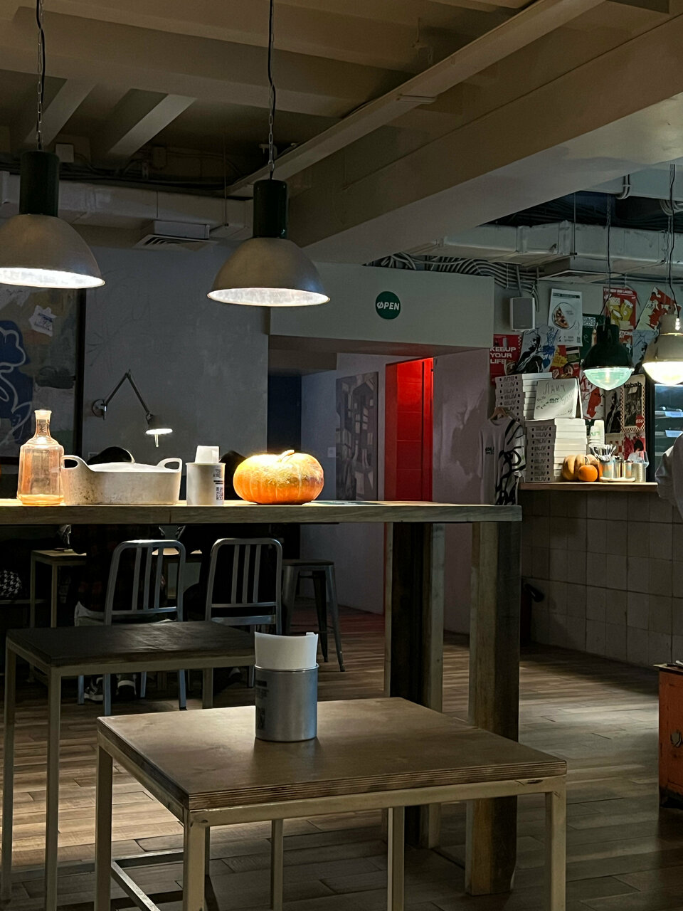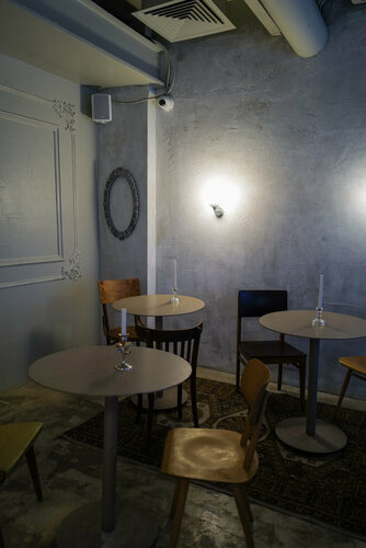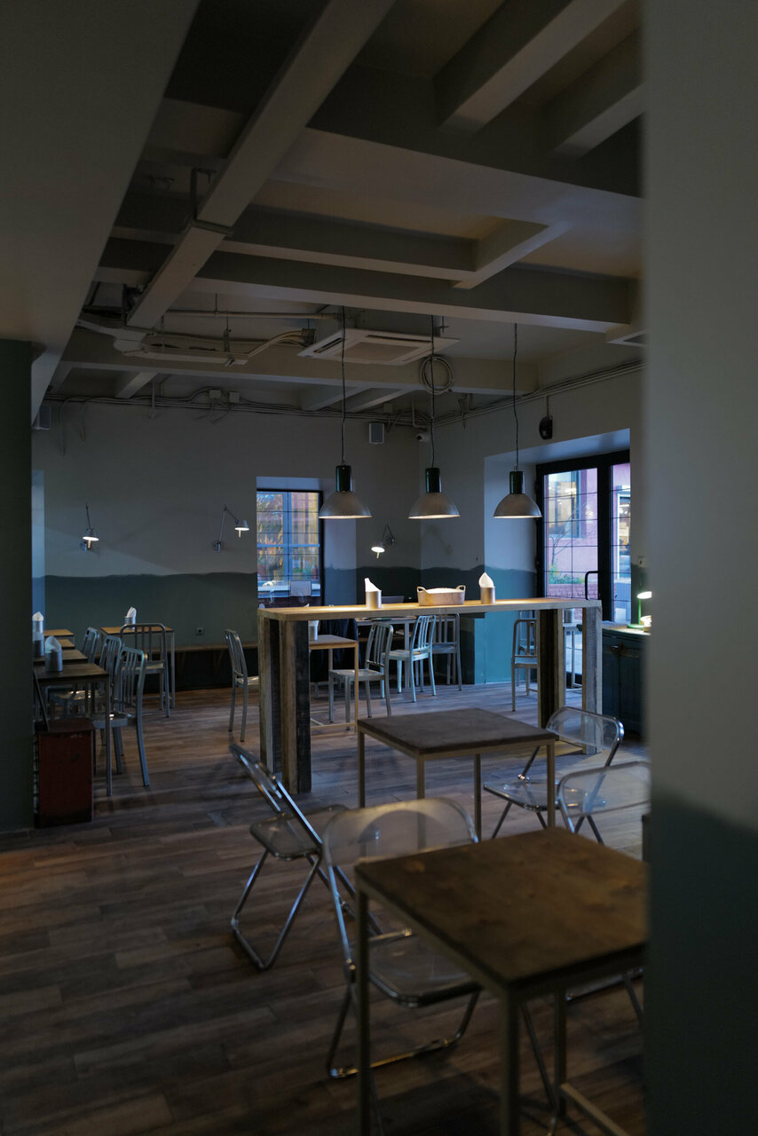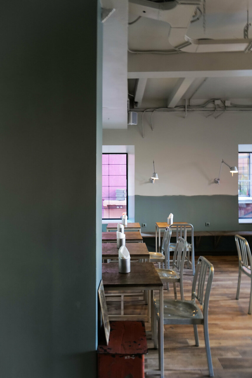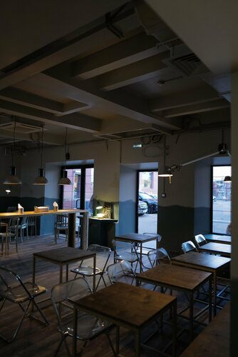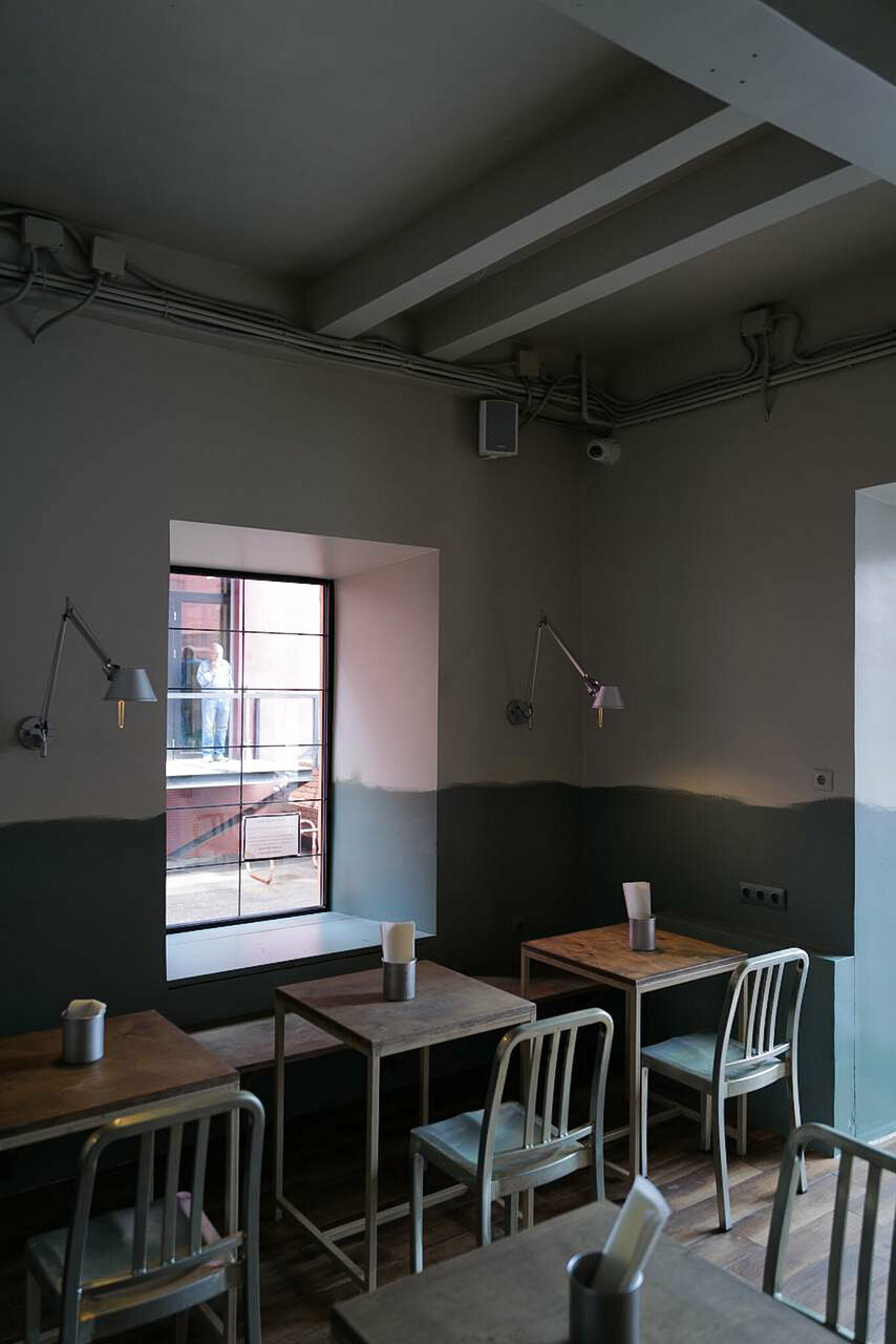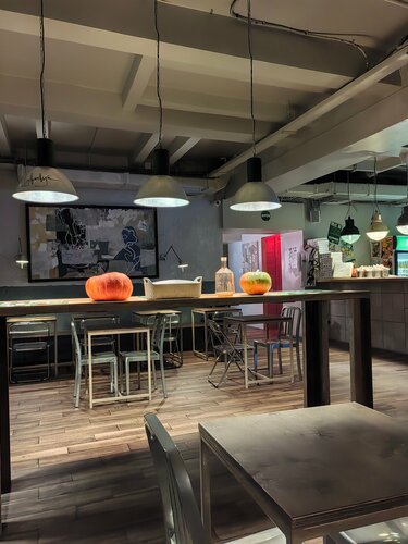 Заведение находится на территории Красного октября, бывшей кондитерской фабрики Эйнема, в Ореховом цеху – поэтому часть мебели стилизована под ореховое дерево.