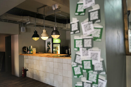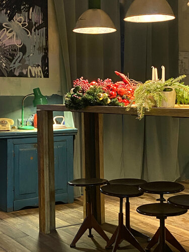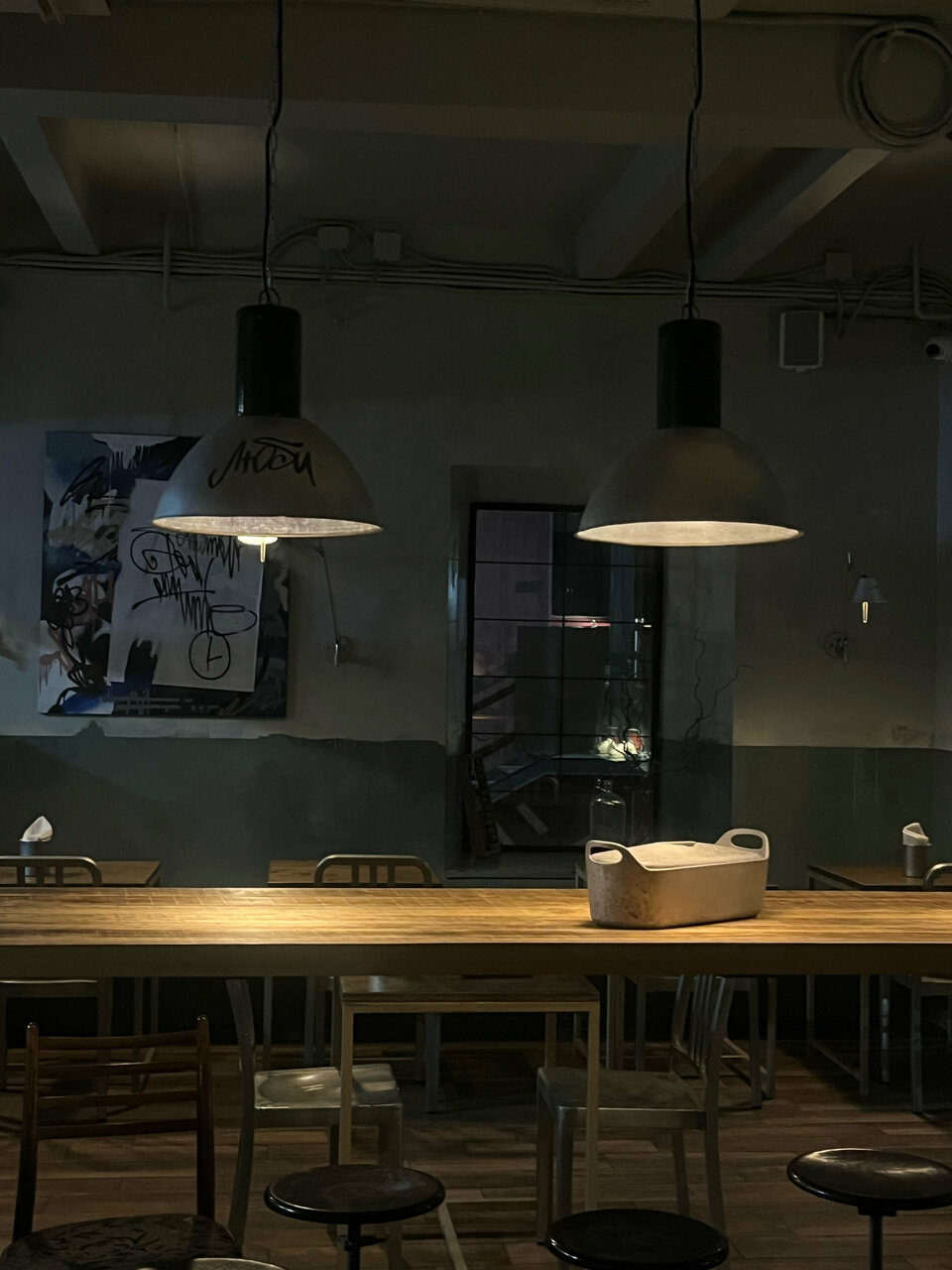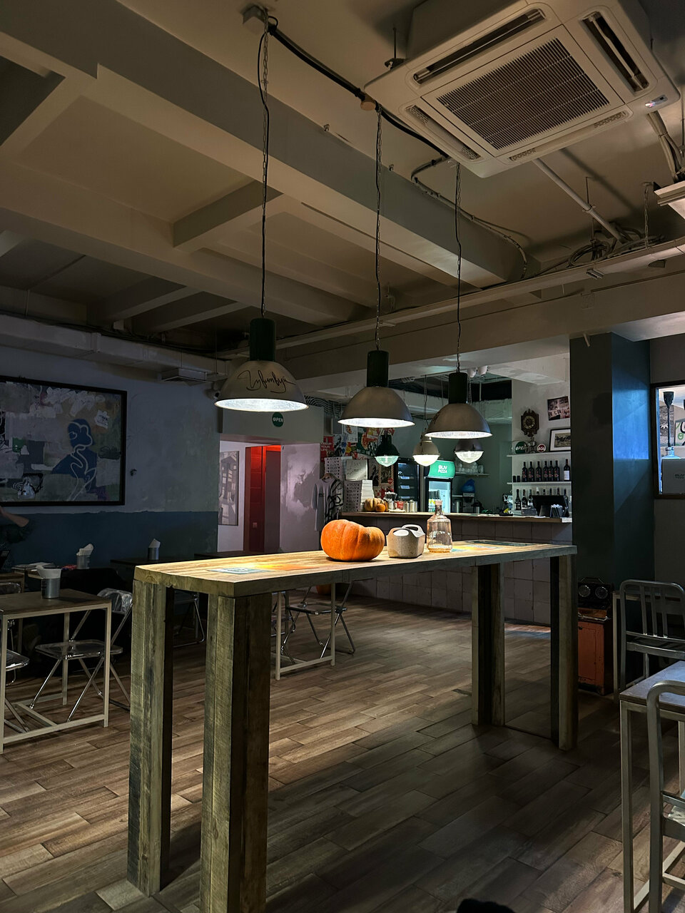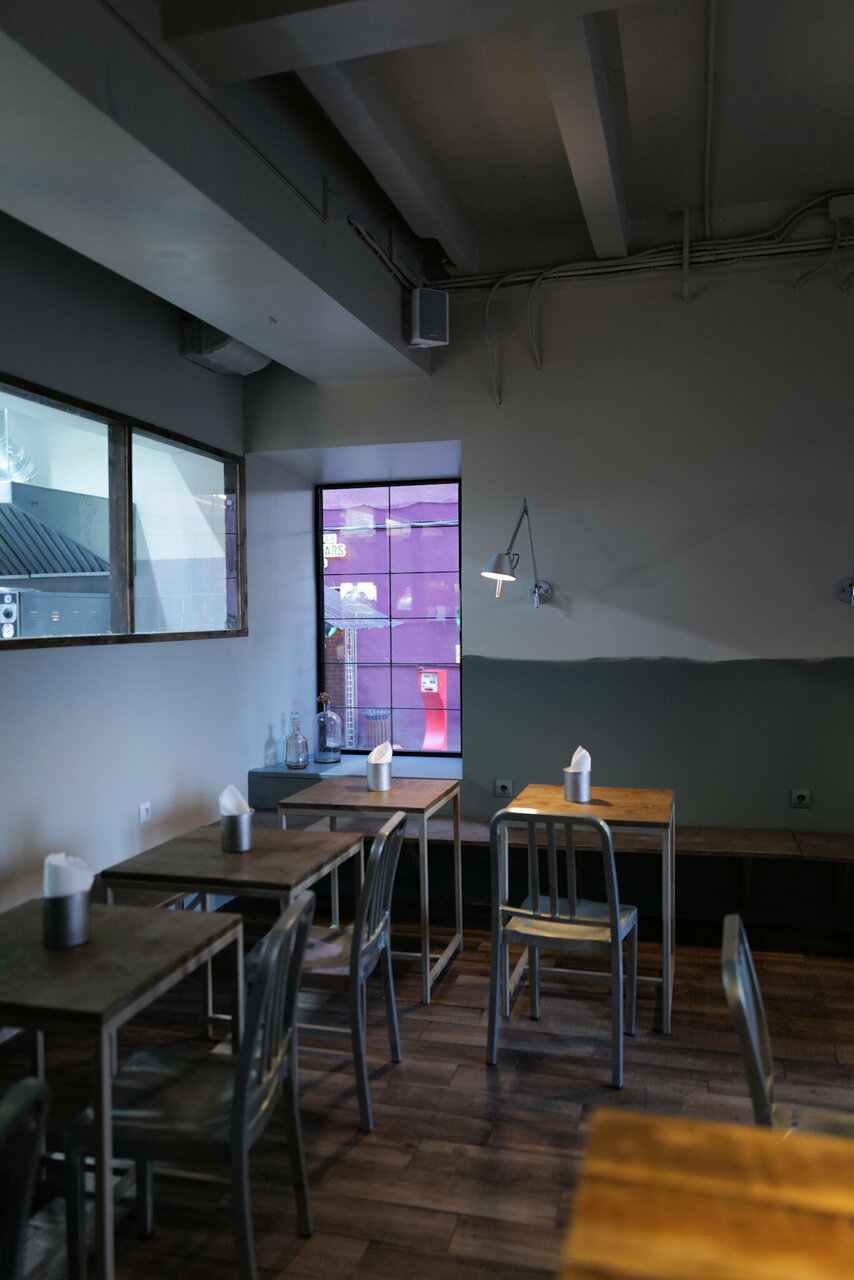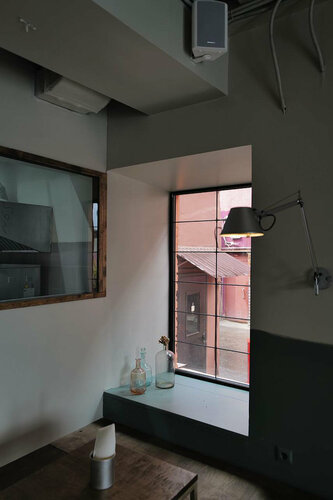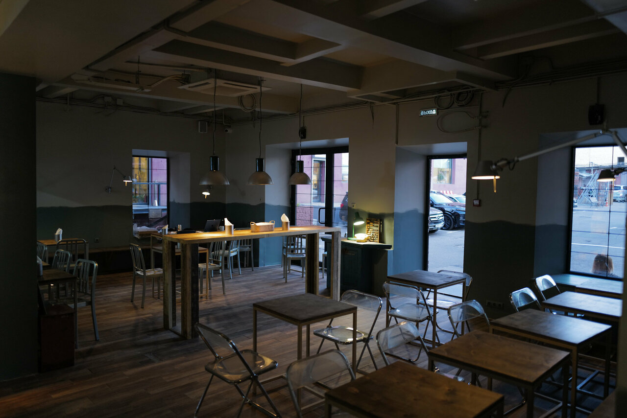 Заведение находится на территории Красного октября, бывшей кондитерской фабрики Эйнема, в Ореховом цеху – поэтому часть мебели стилизована под ореховое дерево.