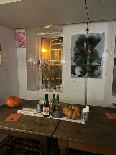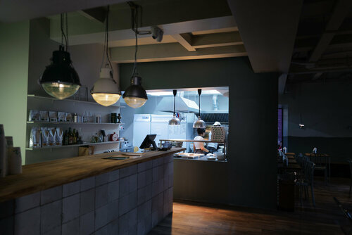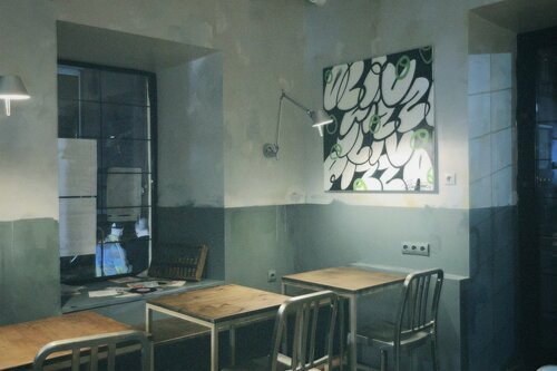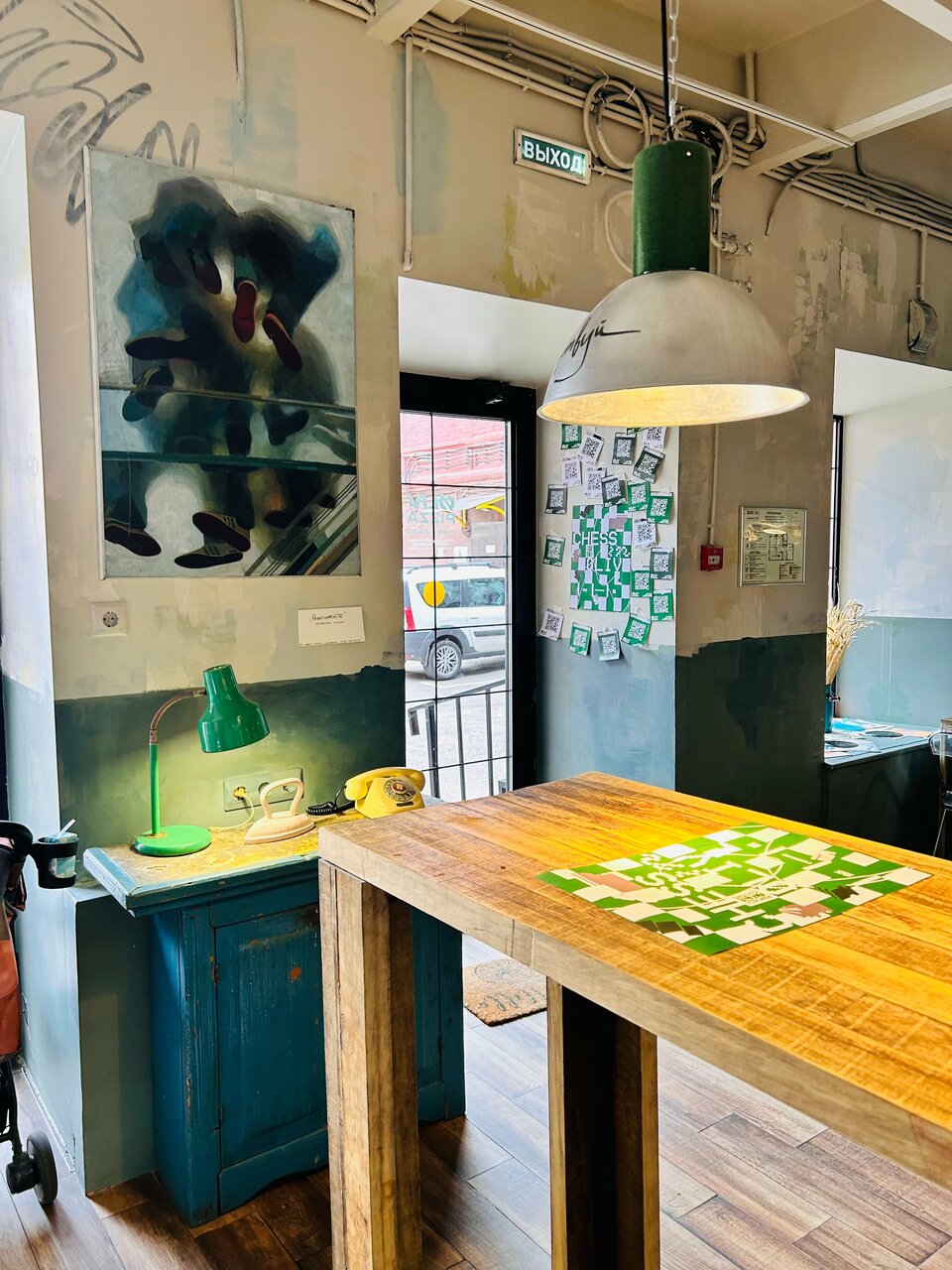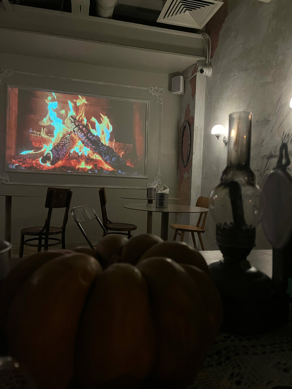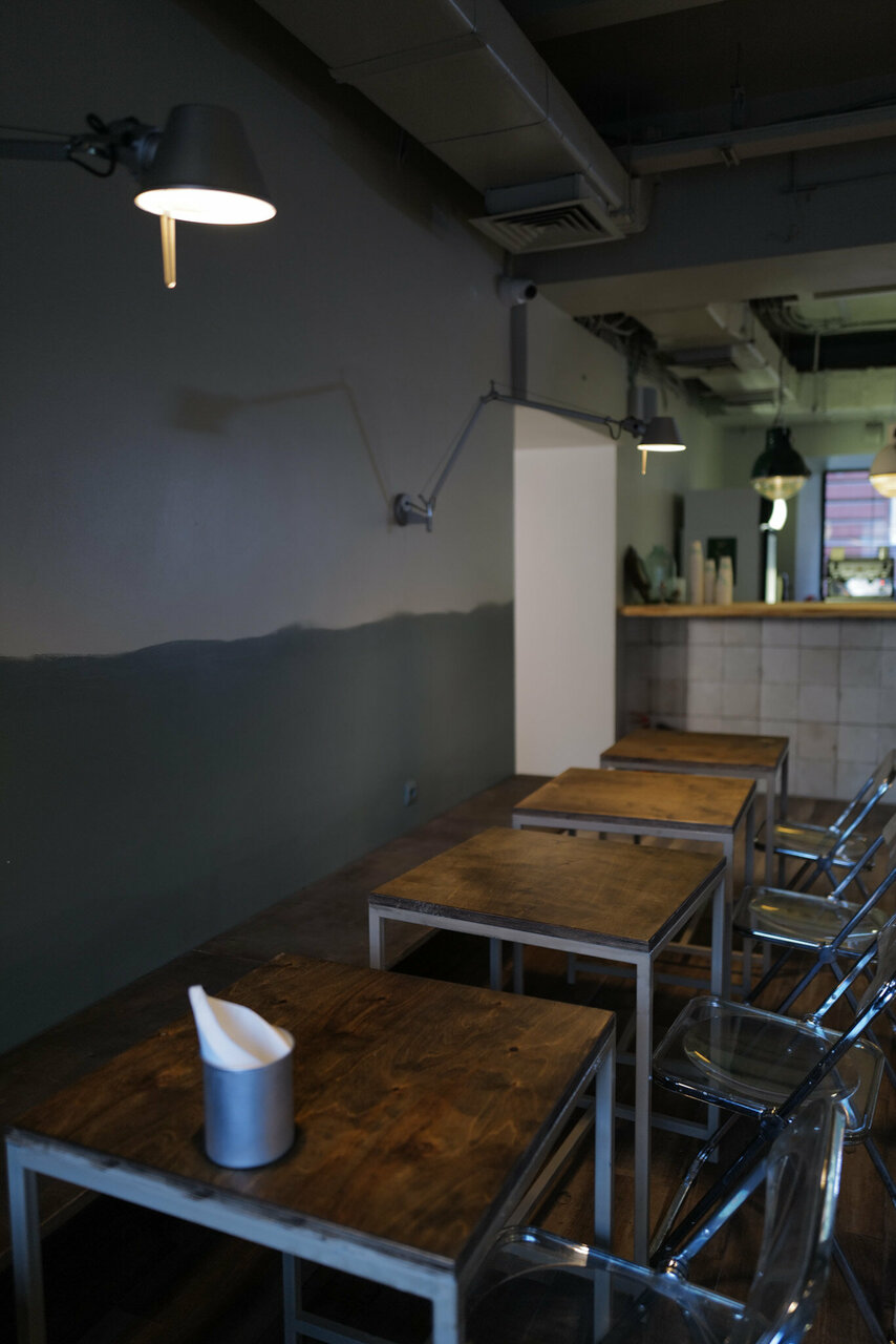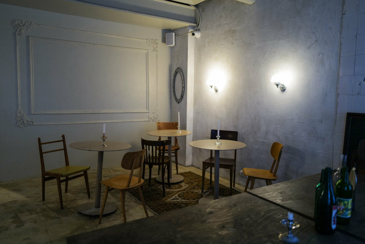 Заведение находится на территории Красного октября, бывшей кондитерской фабрики Эйнема, в Ореховом цеху – поэтому часть мебели стилизована под ореховое дерево.